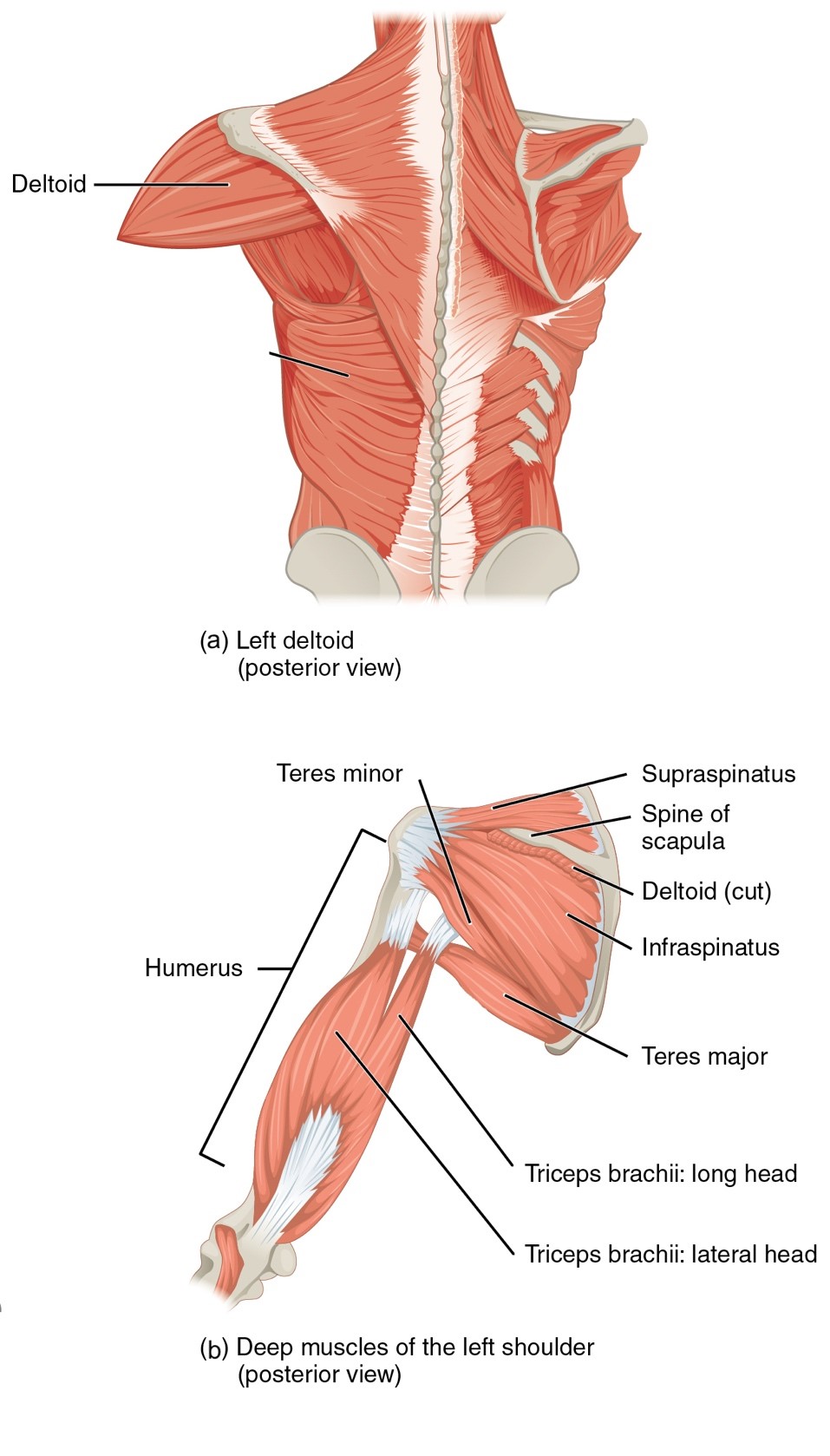 The shoulder anatomy includes the anterior, lateral & posterior deltoids, plus the rotator cuff.